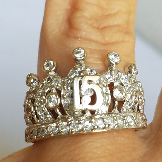 14k Gold 15 Quinceanera Tiera Crown ring white april stone Ring Size 7