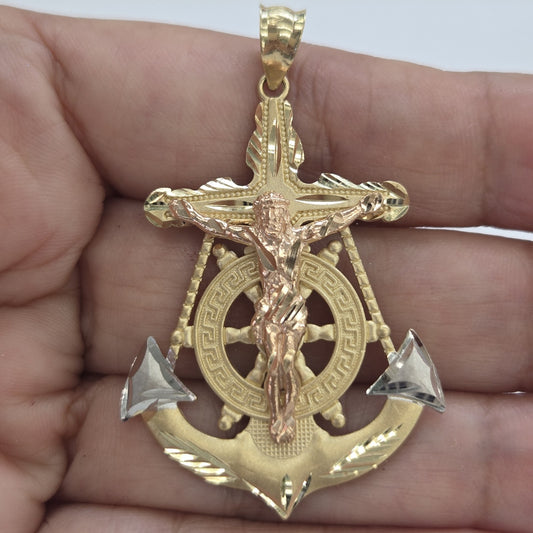 Big 14k Yellow white rose Gold Jesus Crucifix Anchor Pendant 2 Inches long