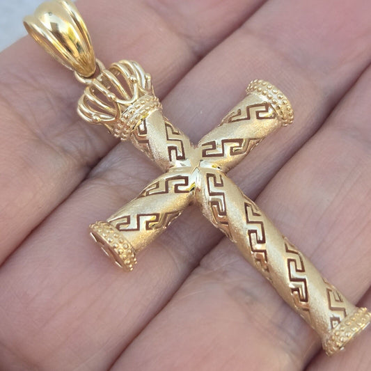 10k Gold Crown Cross Pendant Charm 1.95 inches long Medium Catholic Greek Key
