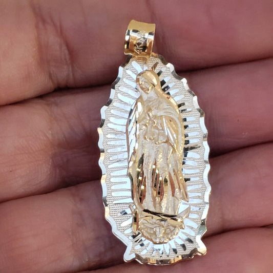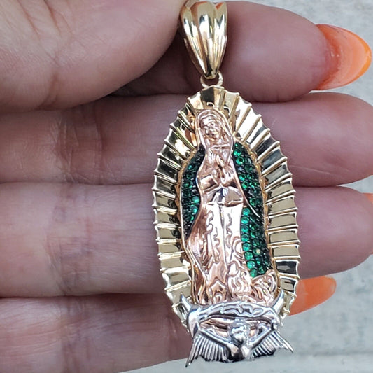 Big Solid 14k gold virgin Mary pendant charm Guadaloupe 2 Inches long Green