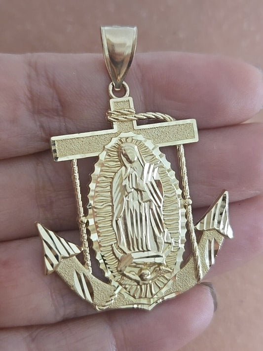 Big solid 14k Gold Virgin Mary Guadalupe Anchor Pendant charm 2 inches long