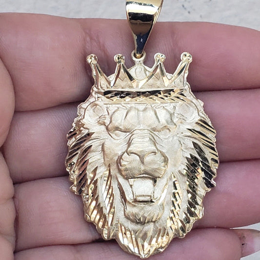 Big solid 14k Yellow Gold crown lion leo Pendant charm 2.25 inch long