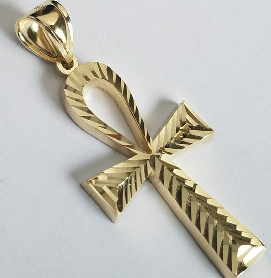 Big Solid 14k yellow Gold diamond cut Egyptian Cross ankh Pendant 2.15 inch long