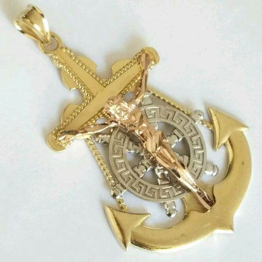Big solid 14k Yellow Gold Jesus Crucifix Anchor Pendant charm 2.25 inch long