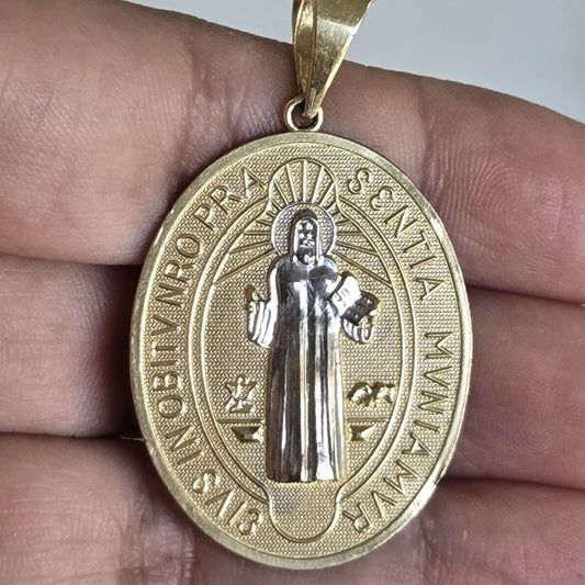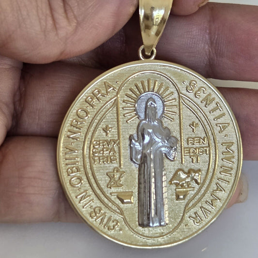 Big solid 14k Gold saint Benito Benedict Pendant Charm medalin 2" long 2 sided