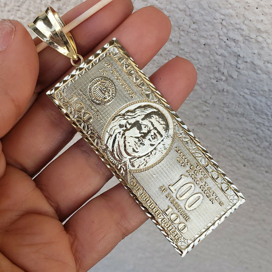 Big xlarge 10k Gold hundred $100 money pendant long two side 3.50 inches long