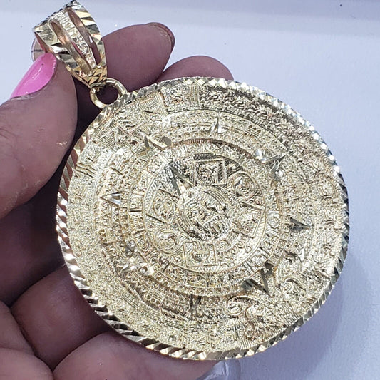 Big xlarge solid 14k Gold round Aztec Calendar Pendant Charm 3.10 inches Heavy
