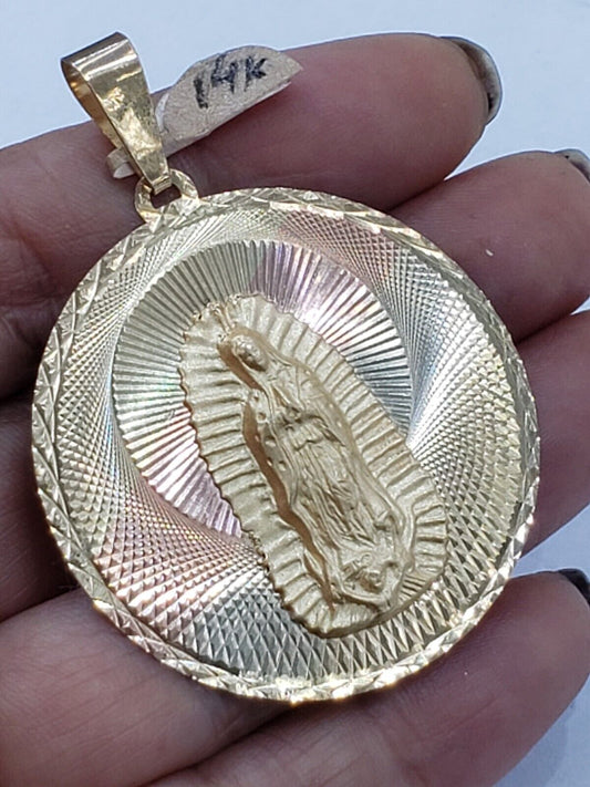 diamond cut big 14k yellow rose gold virgin Mary guadalupe pendant charm 2.15"