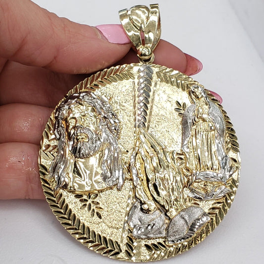 Big xlarge solid 14k Gold round Jesus Virgin Mary Praying Hands Pendant Charm
