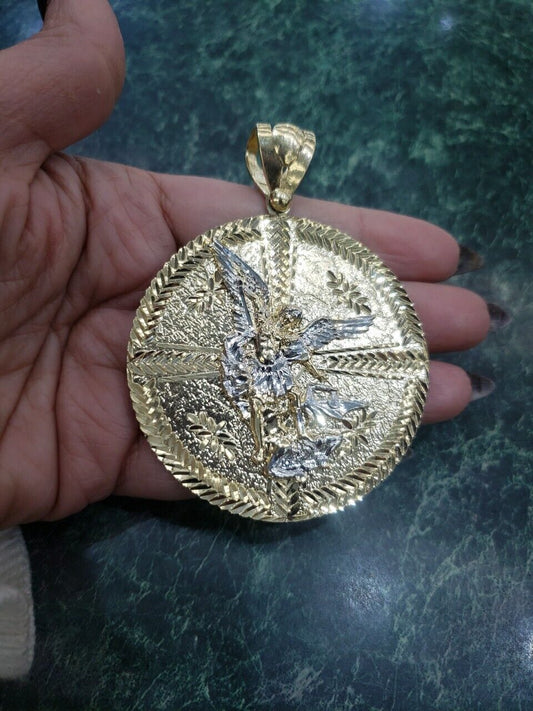 Big xlarge solid 14k Gold round saint Michael Pendant Charm 3.25 inches Heavy