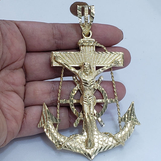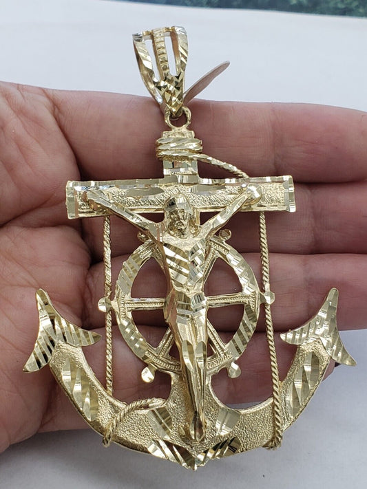 Big xlarge 14k Yellow Gold Jesus Crucifix Anchor Pendant 3.30 inches diamond cut