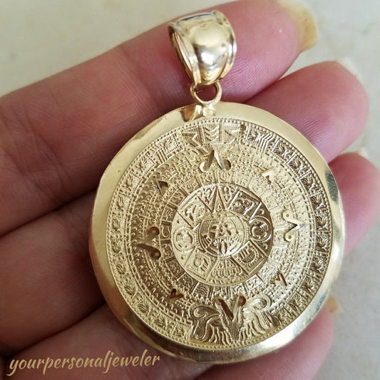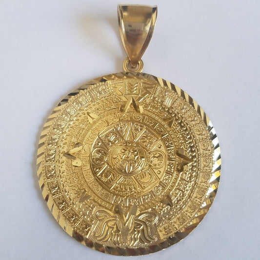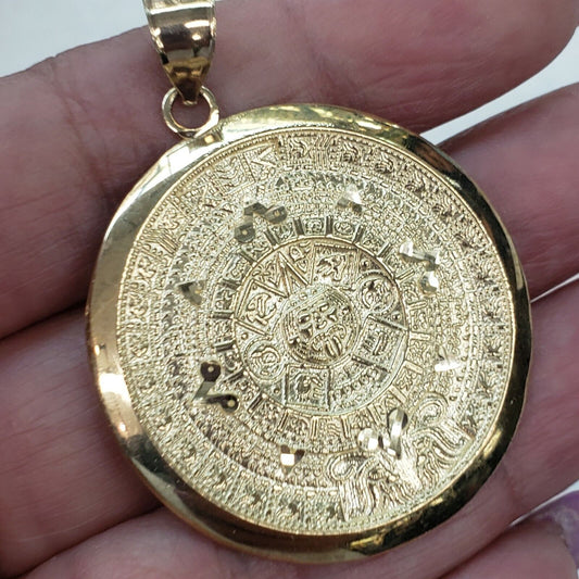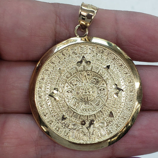Larg Big Solid 14k Gold Aztec Mayan sun calendar Pendant Charm 1.90 Inches Long