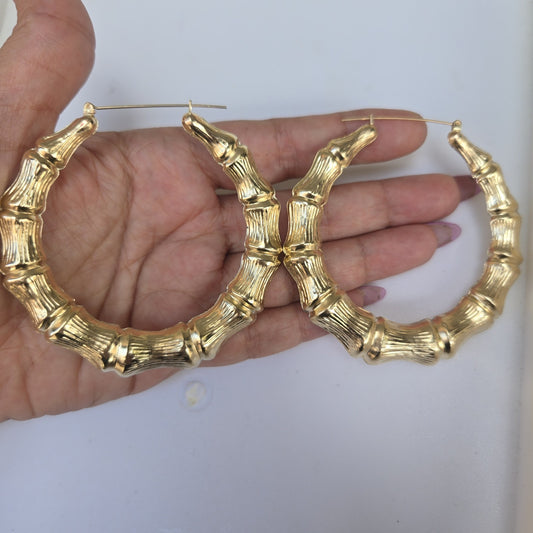 Large Big 10k yellow gold bamboo earrings 2.90 inches long