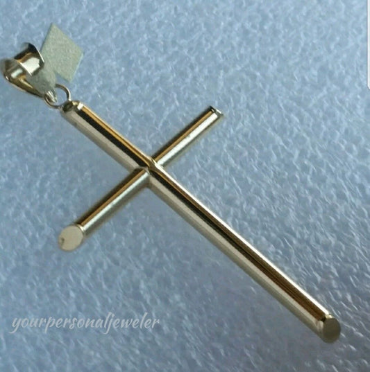 Real 14k Yellow Gold tube Cross Pendant charm 2.20 inch long
