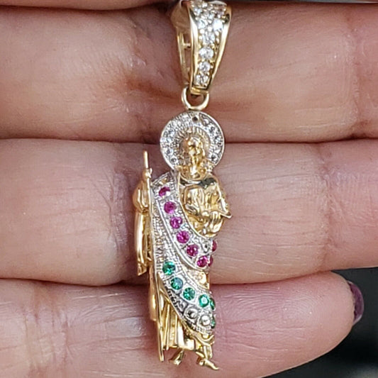 Real 14k yellow Gold Saint Jude judas Pendant charm 1.45 inch long green pink
