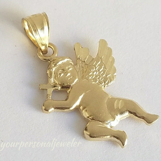10k solid yellow Gold Angel holding cross Pendant Charm 1 inch lomg