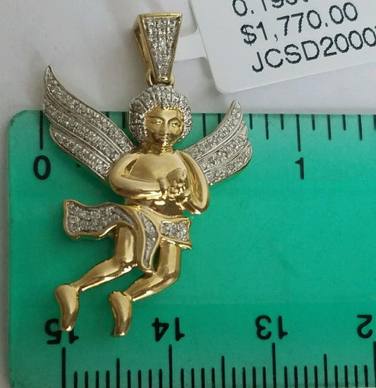 10k solid two tone white yellow Gold Diamonds Angel Pendant charm 1.25 inch lng