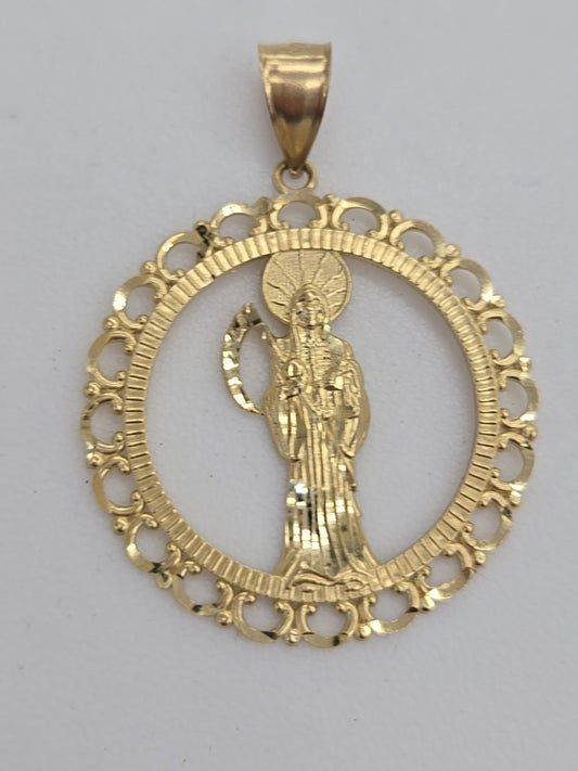 Big Round 14k yellow Gold Santa Muerte Grim Reaper Angel Death pendant 2 inches