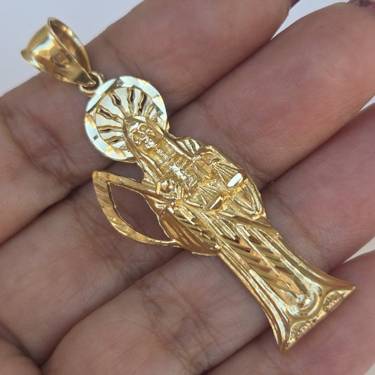 Big 14k solid yellow white Gold Santa Muerte angel of death pendant 2.25" long