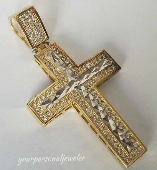 Real 14k yellow white gold diamond cut Cross Pendant 1.90" long