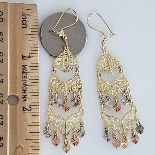 Big long 14k gold dangling hearts gypsy chandelier fligree Earrings 3.40 inch