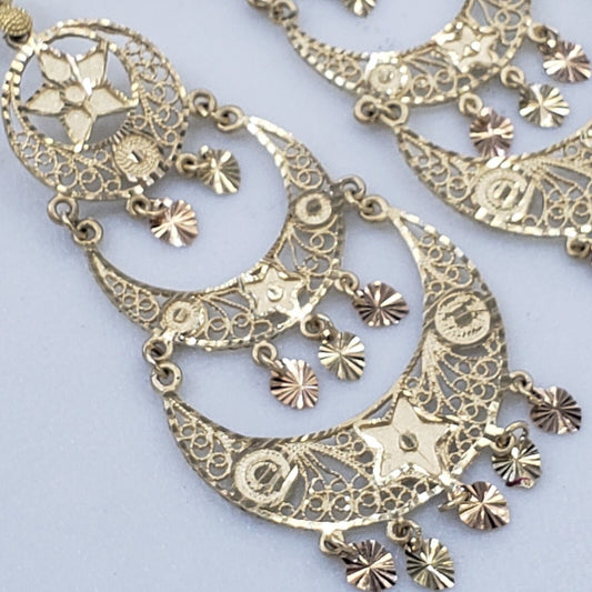 Big Solid 14k gold dangling hearts Star gypsy chandelier fligree Earrings Long