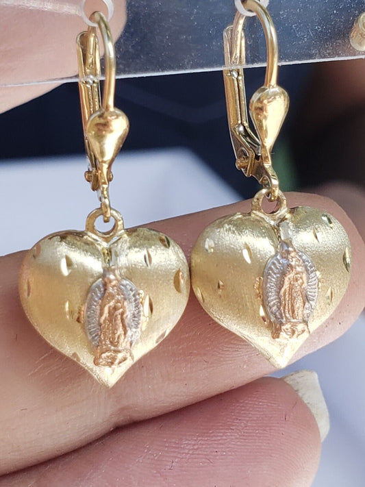 14k Yellow white rose gold dangling heart virgin Mary Earrings 1.5 inch long