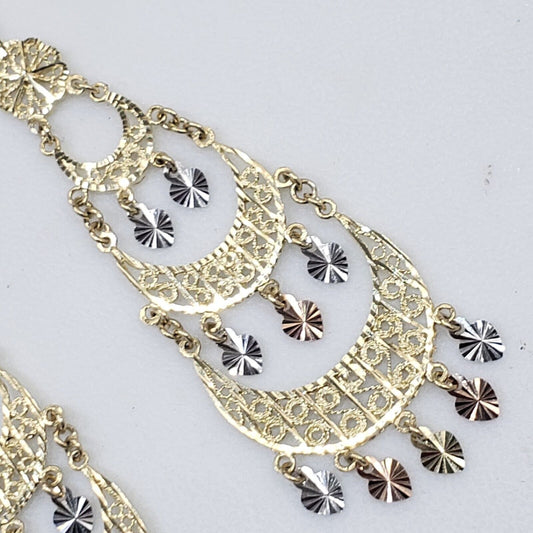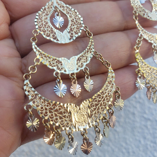 Big long 14k gold dangling hearts gypsy chandelier fligree Earrings 3 inches lng