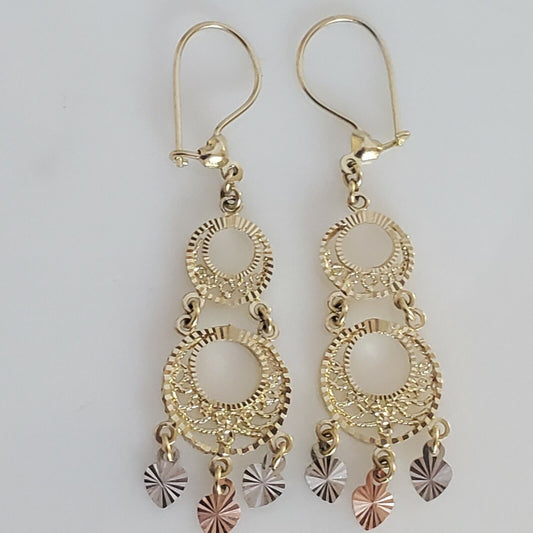 14k gold hearts long dangling Round chandelier Earring 2 inches Diamond Cut 3