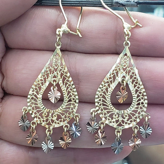 14k gold dangling hearts gypsy chandelier Earrings 2.25" Long fligree Pear Shape