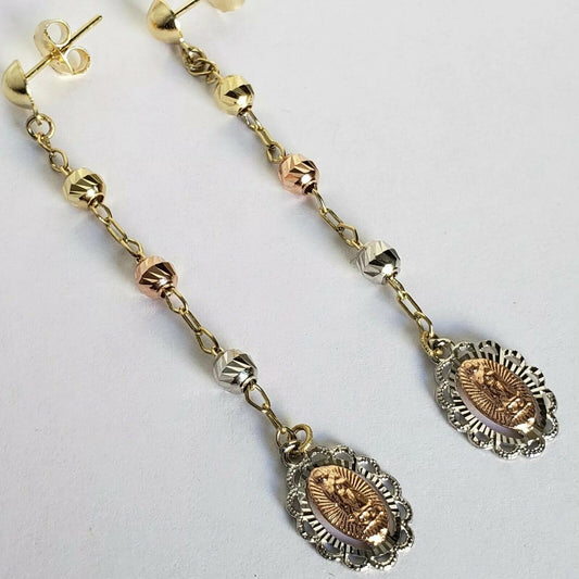 Real 14k hold gold beads virgin mary long drop dangling Guadeloupe earrings