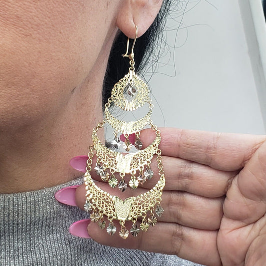 Big long 14k gold dangling hearts gypsy chandelier fligree Earrings 3.20 inched
