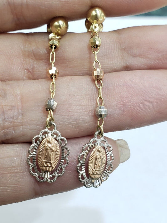 14k yellow white rose gold beads virgin mary long drop dangling earrings 2.5"