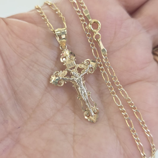 Solid 14k Yellow Gold Jesus Crucifix Cross Pendant 20 Inches Figaro chain set