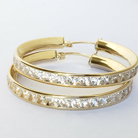 Solid 14k yellow gold eternity round stone hoop earrings 1.25 inch long