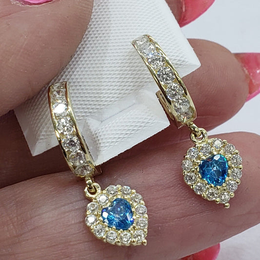 Solid 14k gold Dangling Red Blue Green Heart Small hoop earrings 1 inch long
