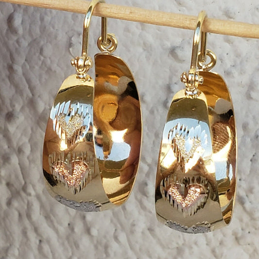 14k solid Gold hoop earrings diamond cut hearts 1.25 inches long medium