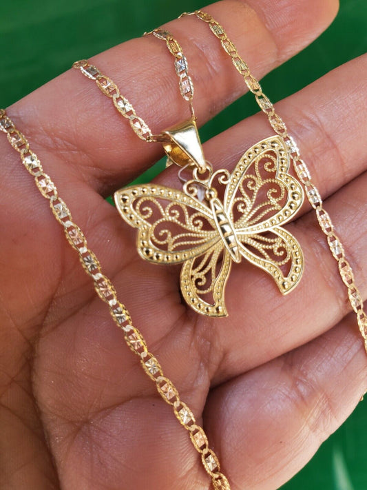 14k gold Butterfly Pendant Charm 2 Mm chain Necklace Set 20 inches long