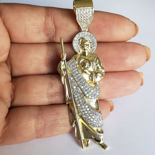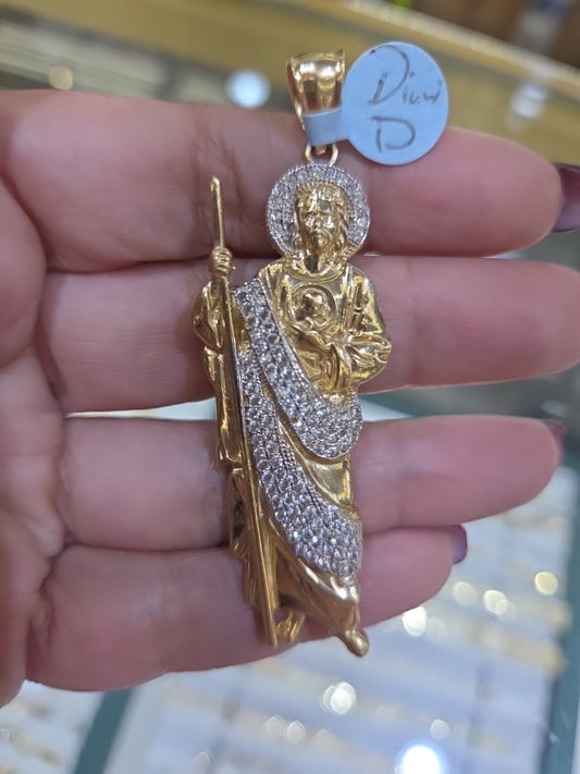 Real 14k Gold Natural Diamonds Saint Jude judas Pendant charm 2.70 inches long
