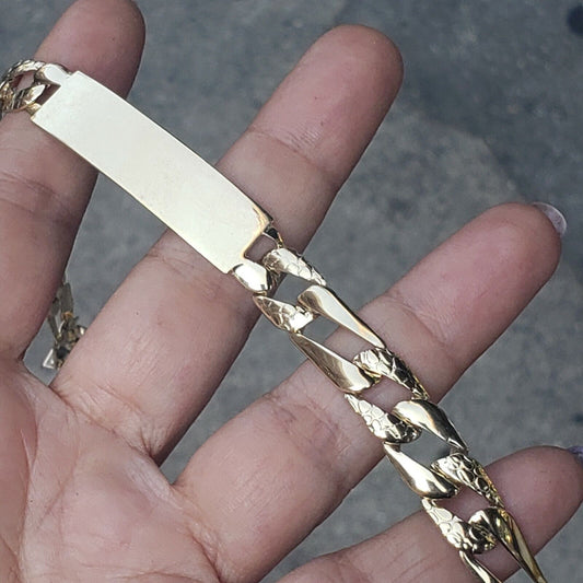 Big Mens 14k Yellow Gold ID Bracelet figaro nugget 9mm Link 8.50 inches long