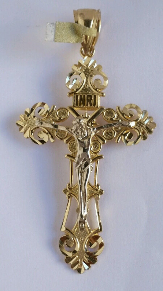 Big 2.40 inch long INRI Two tone 14k yellow Gold Jesus Crucifix Cross Pendant