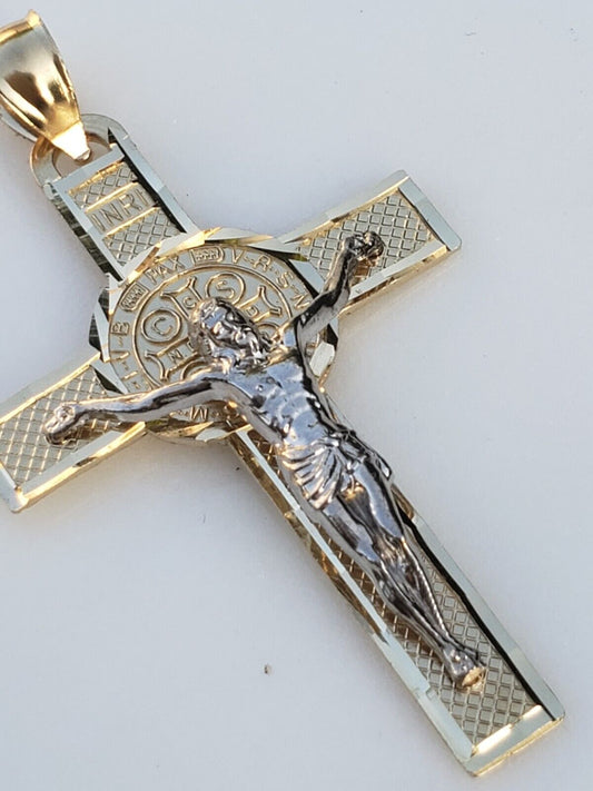 14k Solid Gold Saint Benedict San Benito jesus Cross Pendant Charm 2 sided 1.70"