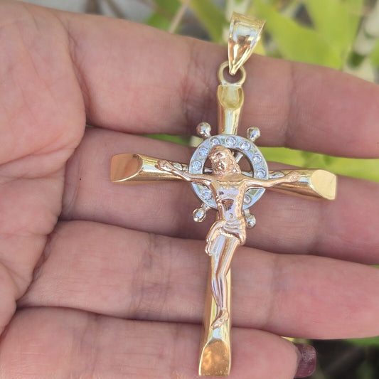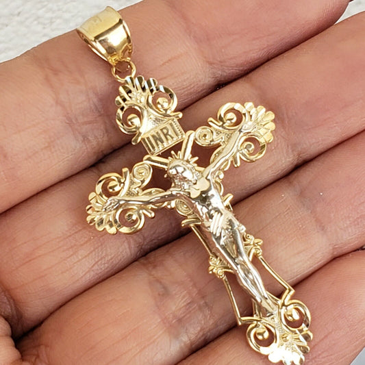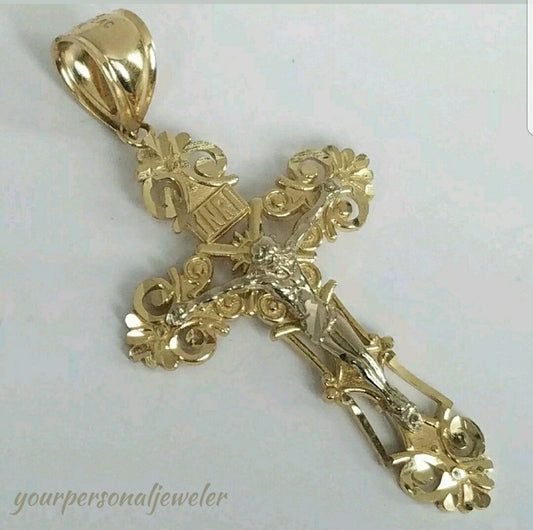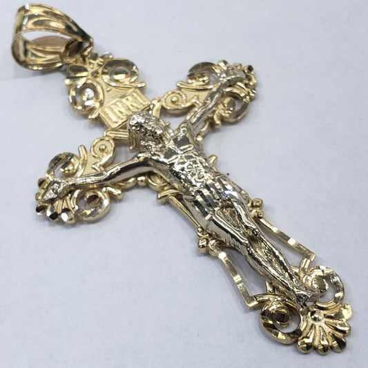 Big diamond cut 2 tone 14k gold Jesus Crucifix Cross Pendant 2 inches long INRI