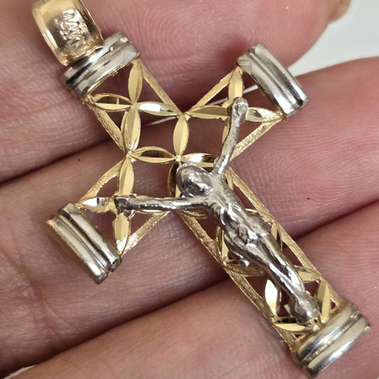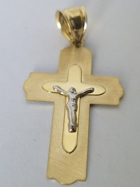 Solid 14k Gold Jesus Crucifix Cross Pendant Two Tone 1.75 Inch Long