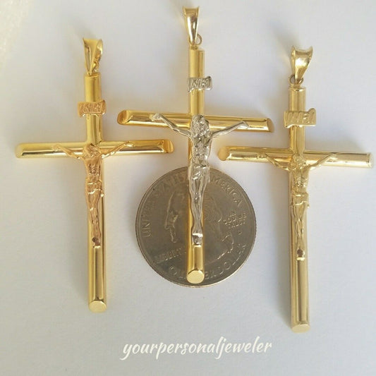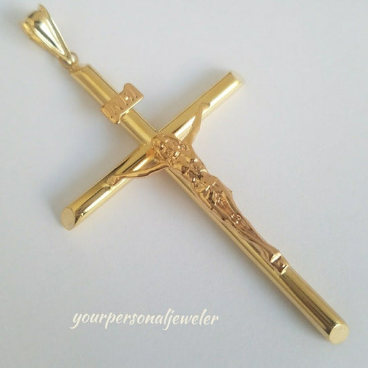 14k Yellow white Gold Jesus Crucifix tube Cross Pendant charm 1.90 inches long