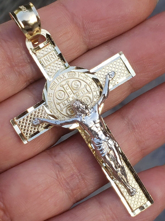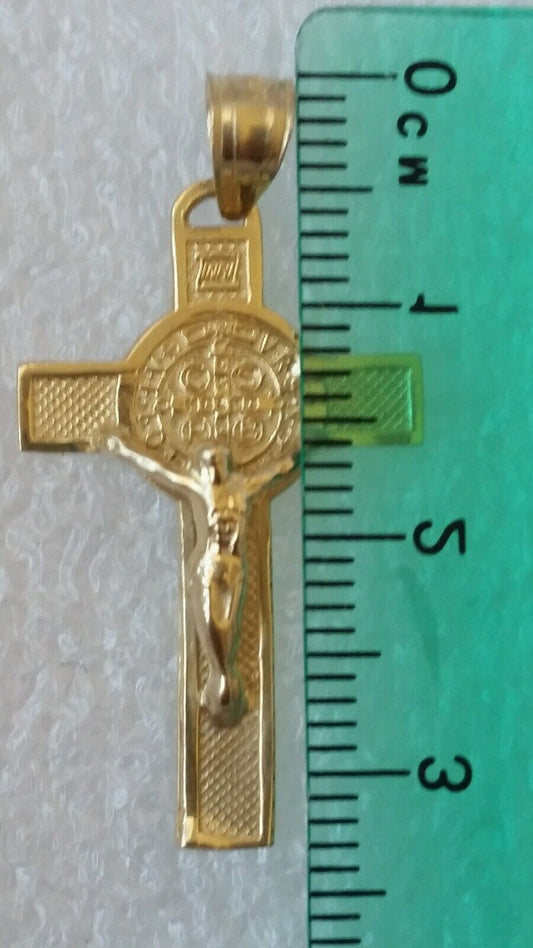 10k solid Yellow Gold Saint Benito crucifix Cross Jesus pendant 33 mm Long