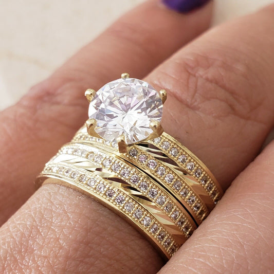 10K yellow Gold round Cut Engagement Wedding Band 3 Ring Set trio