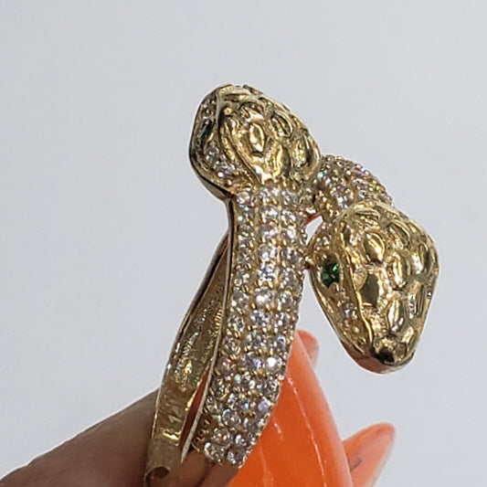Solid 14k yellow gold 2 snake Head Ring Size 5 6 7 8 9 green eye