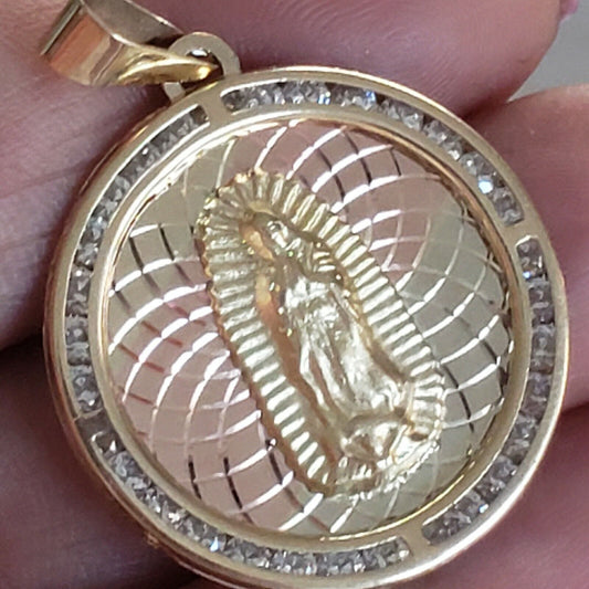 14k yellow gold virgin Mary Holy mother diamond cut round pendant charm 1.40"