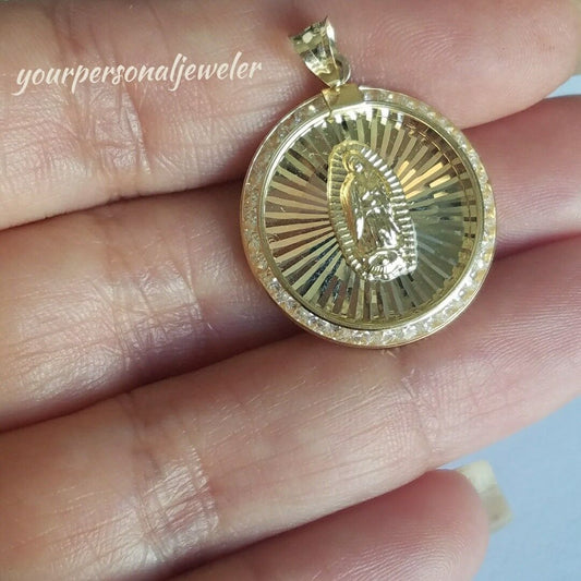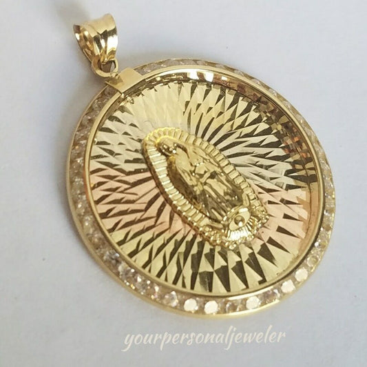 10k yellow gold virgin Mary Holy mother diamond cut round pendant charm 1.1"lng